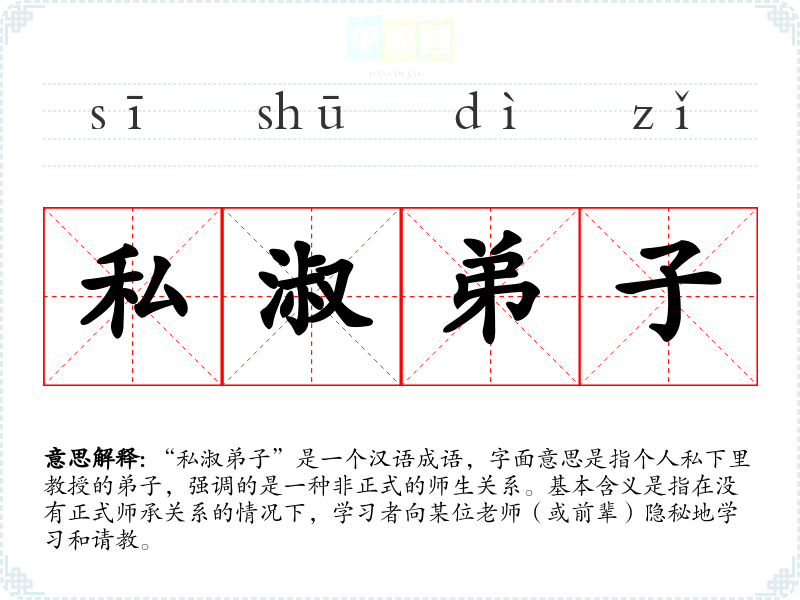 “私淑弟子”是一个汉语成语,字面意思是指个人私下里教授的弟子,强调的是一种非正式的师生关系。基本含义是指在没有正式师承关系的情况下,学者向某位老师(或前辈)隐秘地学和请教。
