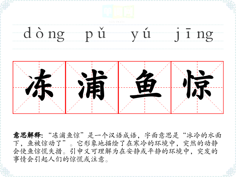 - 反义成语:安然无恙、风平浪静。这些成语则描述了平静、安全的状态,与“冻浦鱼惊”所描绘的突发状态相对。