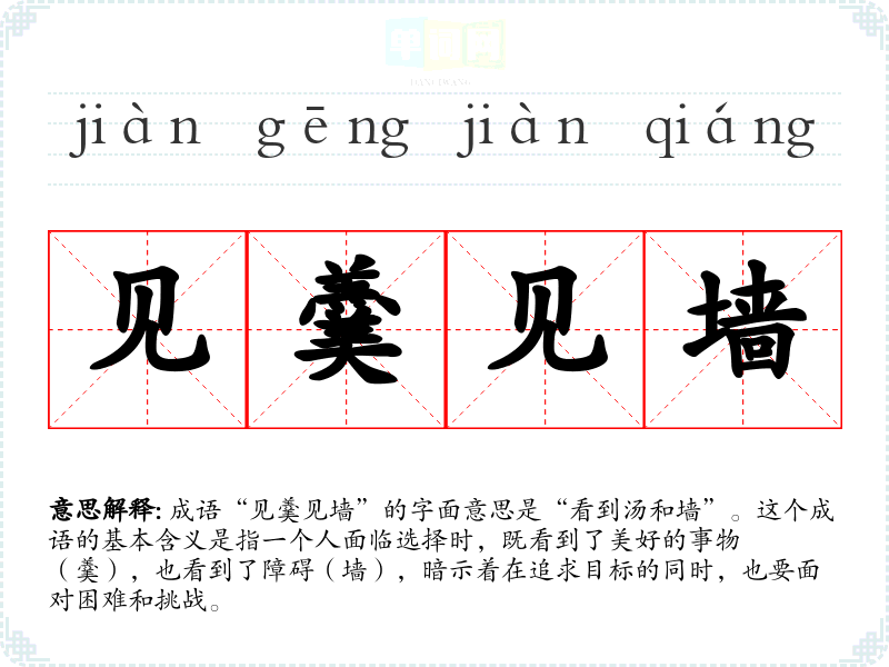 成语“见羹见墙”的字面意思是“看到汤和墙”。这个成语的基本含义是指一个人面临选择时,既看到了美好的事物(羹),也看到了障碍(墙),暗示着在追求目标的同时,也要面对困难和挑战。