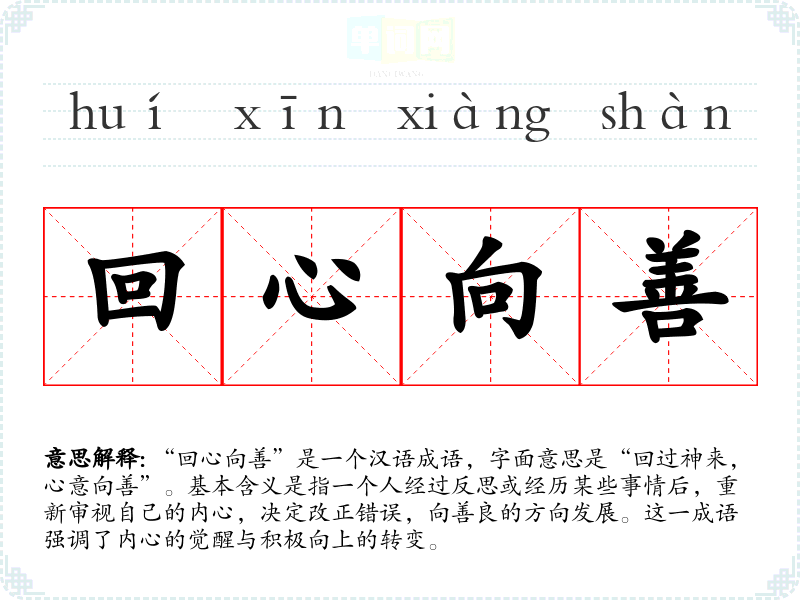 在**传统文化中,重视个人的道德修养和内心的自省。“回心向善”体现了对人性善恶的思考,符合儒家“仁”的理念。在现代社会,这一成语依然适用,特别是在心理健康和自我提升的讨论中,鼓励人们进行自我反省,追求内心的平和与善良。