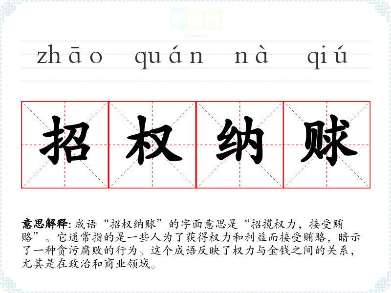成语“招权纳赇”的字面意思是“招揽权力,接受贿赂”。它通常指的是一些人为了获得权力和利益而接受贿赂,暗示了一种贪污腐败的行为。这个成语反映了权力与金钱之间的关系,尤其是在政治和商业领域。
