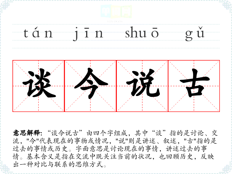 “谈今说古”由四个字组成,其中“谈”指的是讨论、交流,"今"代表现在的事物或情况,"说"则是讲述、叙述,"古"指的是过去的事情或历史。字面意思是讨论现在的事情,讲述过去的事情。基本含义是指在交流中既关注当前的状况,也回顾历史,反映出一种对比与联系的思维方式。
