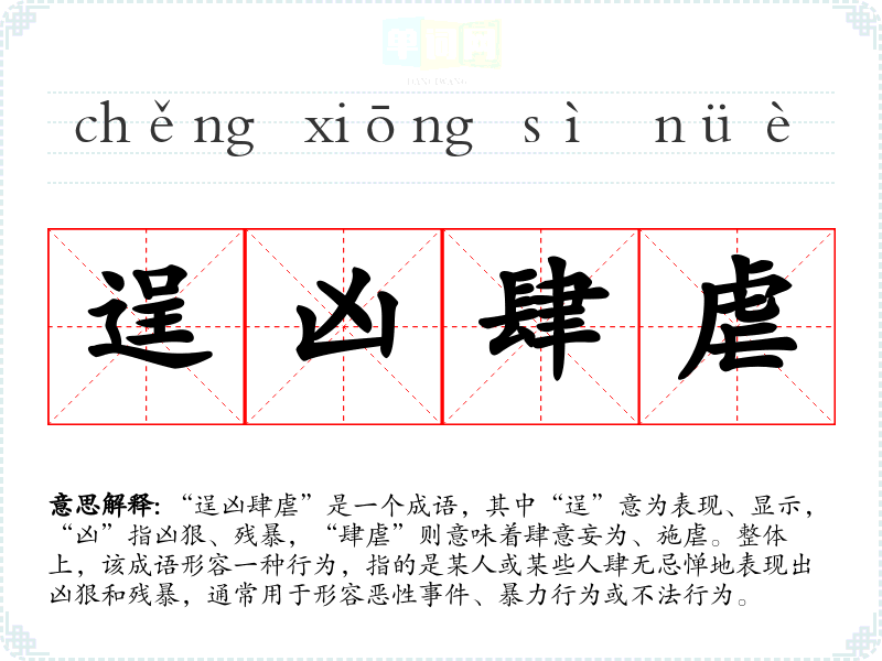 “逞凶肆虐”并没有明确的历史典故或文学出处,但可以推测其形成与古代社会对暴力行为的普遍反感和对社会秩序的维护有关。在古代,社会常常受到强权和暴力的威胁,因此这种描述残暴行为的成语自然会被广泛使用。