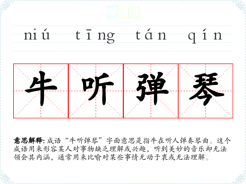 “牛听弹琴”出自《庄子·外物》,原文提到“子贡问于孔子曰:‘君子之道,何以为之?’孔子曰:‘牛听弹琴’,意在说明有些事情或事物的存在并不一定会被所有人所理解或欣赏。这个成语的使用反映了古人对牛这种动物的观察,牛虽然听到了音乐,但因其本性和智慧的限制,无法理解音乐的美。