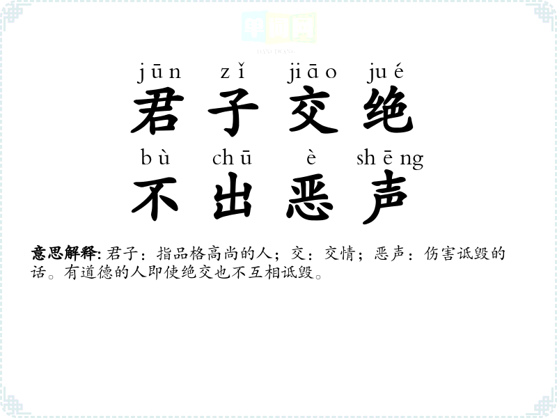 | 君子不夺人之好 | 君子:指品格高尚的人;好:喜爱。道德高尚的人不夺取人家喜爱的东西。 |