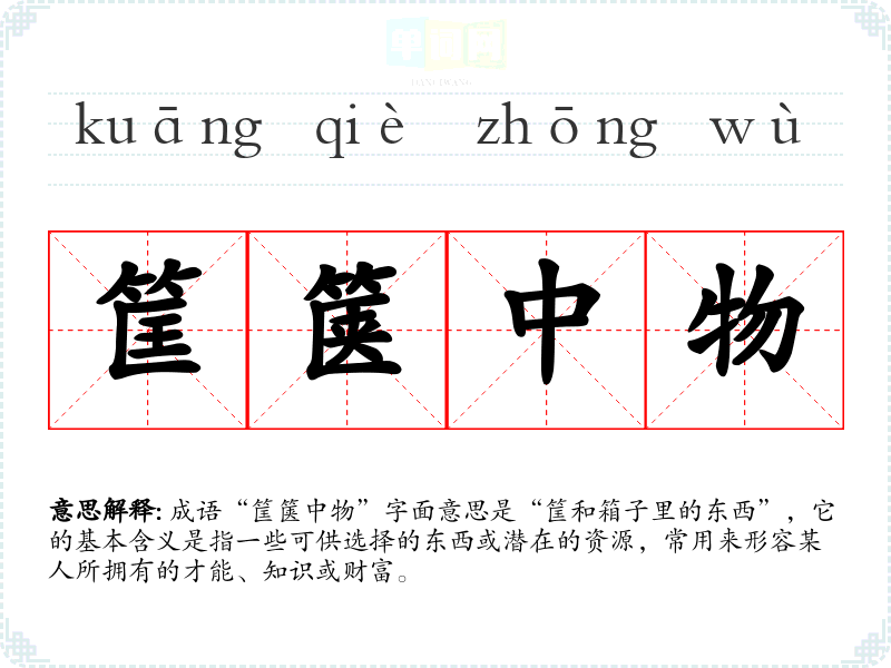 成语“筐箧中物”字面意思是“筐和箱子里的东西”,它的基本含义是指一些可供选择的东西或潜在的资源,常用来形容某人所拥有的才能、知识或财富。