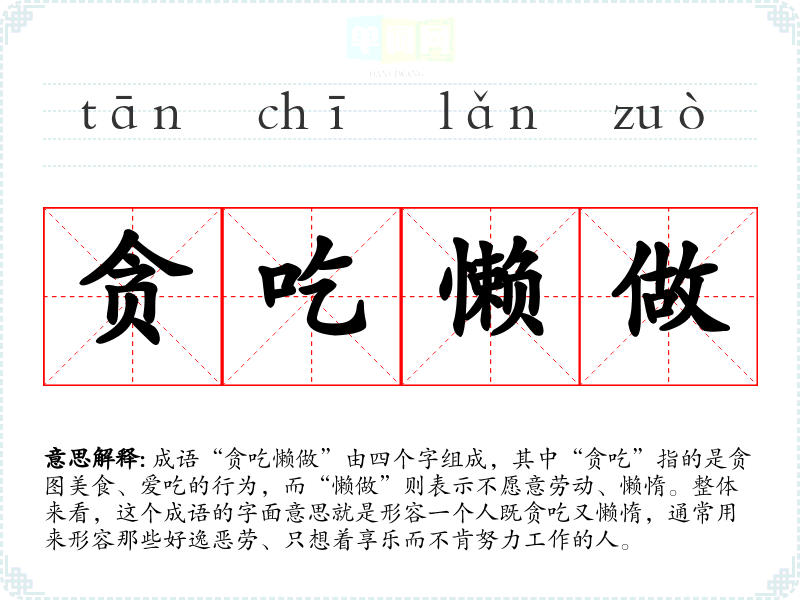 成语“贪吃懒做”由四个字组成,其中“贪吃”指的是贪图美食、爱吃的行为,而“懒做”则表示不愿意劳动、懒惰。整体来看,这个成语的字面意思就是形容一个人既贪吃又懒惰,通常用来形容那些好逸恶劳、只想着享乐而不肯努力工作的人。