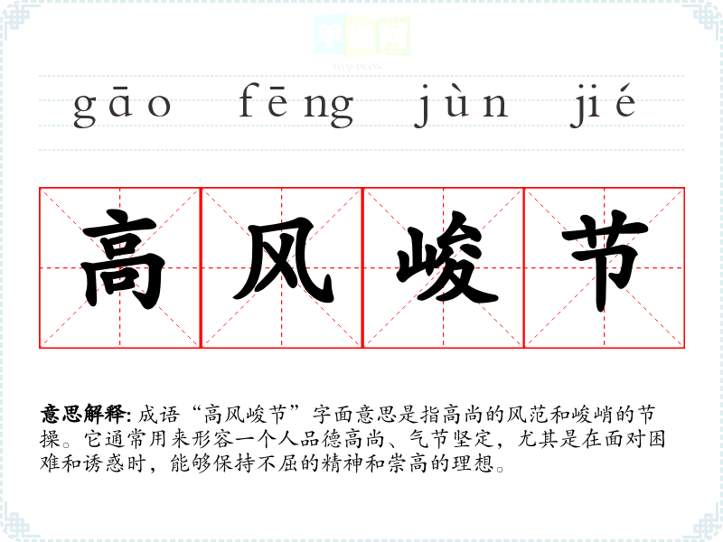 成语“高风峻节”字面意思是指高尚的风范和峻峭的节操。它通常用来形容一个人品德高尚、气节坚定,尤其是在面对困难和诱惑时,能够保持不屈的精神和崇高的理想。