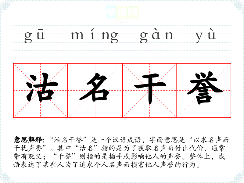 “沽名干誉”是一个汉语成语,字面意思是“以求名声而干扰声誉”。其中“沽名”指的是为了获取名声而付出代价,通常带有贬义;“干誉”则指的是插手或影响他人的声誉。整体上,成语表达了某些人为了追求个人名声而损害他人声誉的行为。