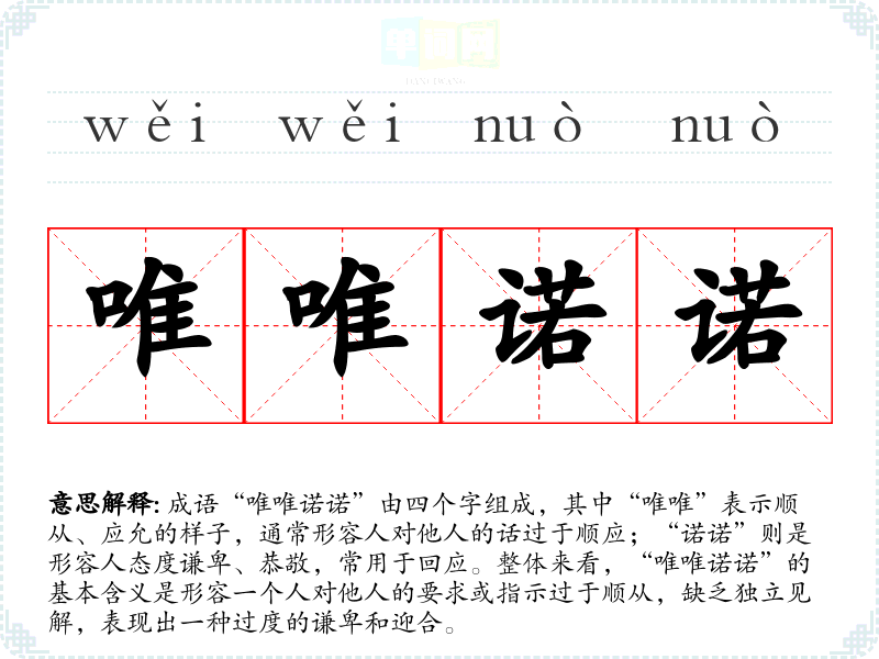 成语“唯唯诺诺”由四个字组成,其中“唯唯”表示顺从、应允的样子,通常形容人对他人的话过于顺应;“诺诺”则是形容人态度谦卑、恭敬,常用于回应。整体来看,“唯唯诺诺”的基本含义是形容一个人对他人的要求或指示过于顺从,缺乏独立见解,表现出一种过度的谦卑和迎合。