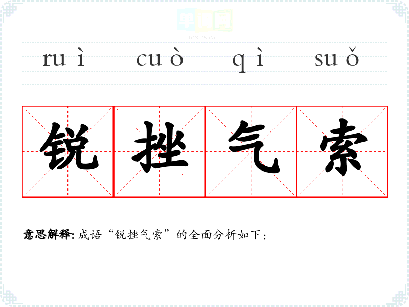 “锐挫气索”字面意思是指锐气被削弱,斗志减退。基本含义是形容一个人的锐气、斗志因为某些原因而受到挫折或打击,表现出消沉或无精打采的状态。