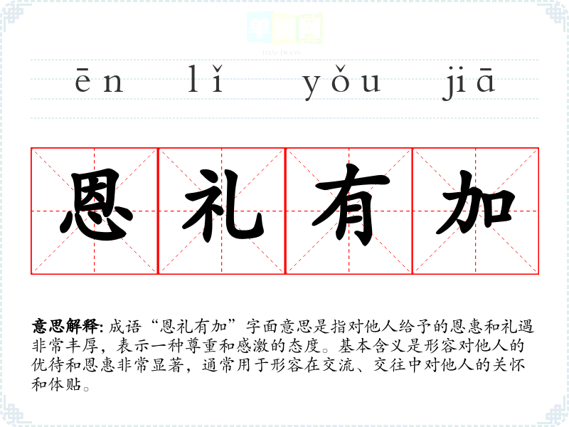 - 日常对话:可以用来形容某人对他人的关心,比如“他对待客人总是恩礼有加”。