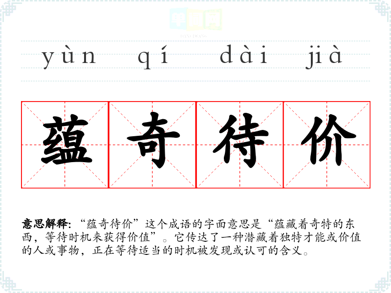 “蕴奇待价”这个成语的字面意思是“蕴藏着奇特的东西,等待时机来获得价值”。它传达了一种潜藏着独特才能或价值的人或事物,正在等待适当的时机被发现或认可的含义。