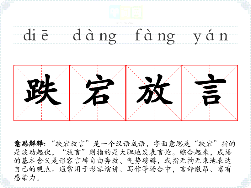 “跌宕放言”是一个汉语成语,字面意思是“跌宕”指的是波动起伏,“放言”则指的是大胆地发表言论。综合起来,成语的基本含义是形容言辞自由奔放、气势磅礴,或指无拘无束地表达自己的观点。通常用于形容演讲、写作等场合中,言辞激昂、富有感染力。