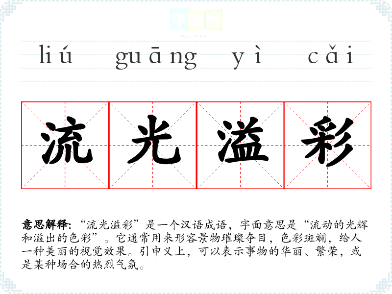 “流光溢彩”是一个汉语成语,字面意思是“流动的光辉和溢出的色彩”。它通常用来形容景物璀璨夺目,色彩斑斓,给人一种美丽的视觉效果。引申义上,可以表示事物的华丽、繁荣,或是某种场合的热烈气氛。