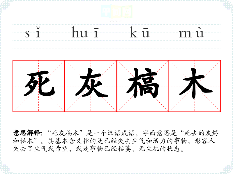 “死灰槁木”是一个汉语成语,字面意思是“死去的灰烬和枯木”。其基本含义指的是已经失去生气和活力的事物,形容人失去了生气或希望,或是事物已经枯萎、无生机的状态。