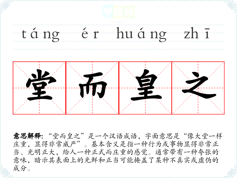 | 堂而皇之 | 堂皇:官署的大堂,引申为气势盛大的样子。形容端正庄严或雄伟有气派。也指表面上庄严正大,堂堂正正,实际却不然。 |