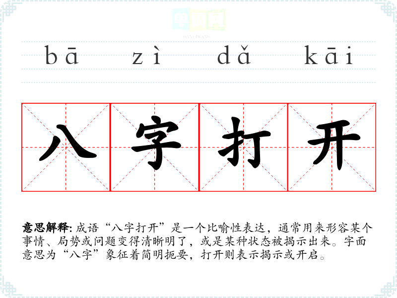 成语“八字打开”是一个比喻性表达,通常用来形容某个事情、局势或问题变得清晰明了,或是某种状态被揭示出来。字面意思为“八字”象征着简明扼要,打开则表示揭示或开启。