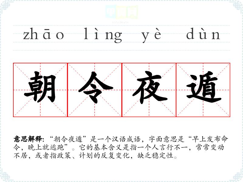 “朝令夜遁”是一个汉语成语,字面意思是“早上发布命令,晚上就逃跑”。它的基本含义是指一个人言行不一,常常变动不居,或者指政策、计划的反复变化,缺乏稳定性。