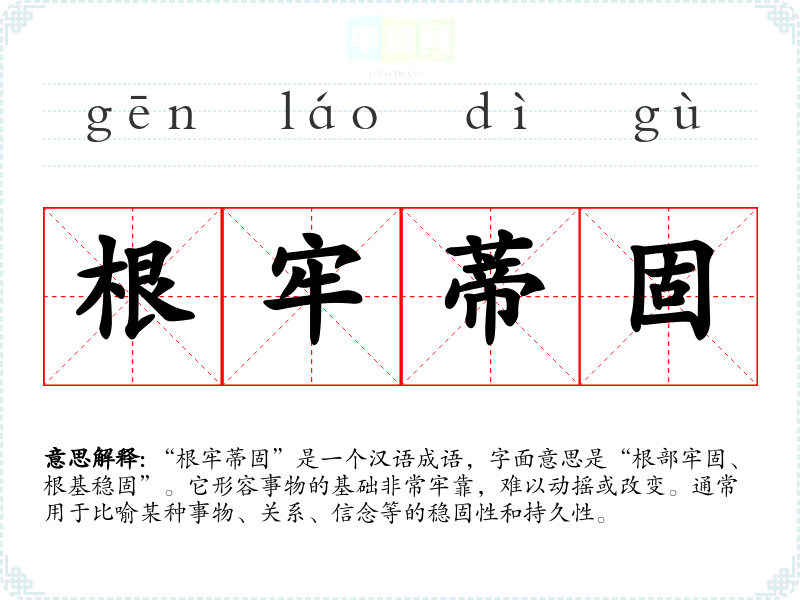 “根牢蒂固”是一个汉语成语,字面意思是“根部牢固、根基稳固”。它形容事物的基础非常牢靠,难以动摇或改变。通常用于比喻某种事物、关系、信念等的稳固性和持久性。