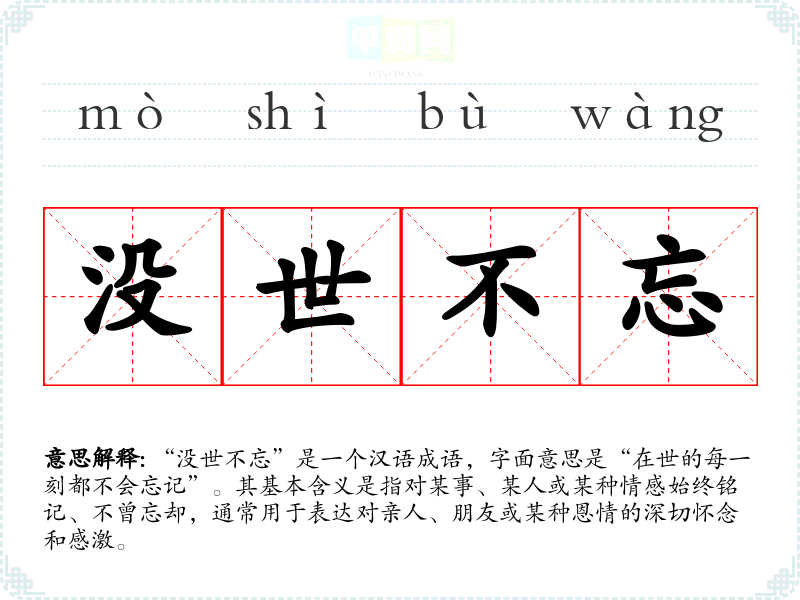 “没世不忘”是一个汉语成语,字面意思是“在世的每一刻都不会忘记”。其基本含义是指对某事、某人或某种情感始终铭记、不曾忘却,通常用于表达对亲人、朋友或某种恩情的深切怀念和感激。