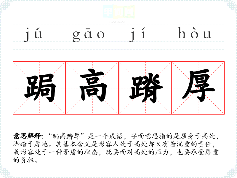 “跼高蹐厚”是一个成语,字面意思指的是屈身于高处,脚踏于厚地。其基本含义是形容人处于高处却又有着沉重的责任,或形容处于一种矛盾的状态,既要面对高处的压力,也要承受厚重的负担。