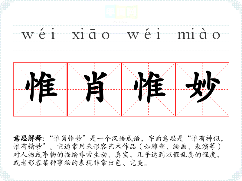 “惟肖惟妙”是一个汉语成语,字面意思是“惟有神似,惟有精妙”。它通常用来形容艺术作品(如雕塑、绘画、表演等)对人物或事物的描绘非常生动、真实,几乎达到以假乱真的程度,或者形容某种事物的表现非常出色、完美。