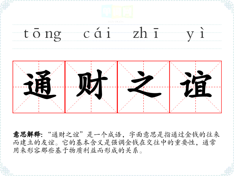 “通财之谊”是一个成语,字面意思是指通过金钱的往来而建立的友谊。它的基本含义是强调金钱在交往中的重要性,通常用来形容那些基于物质利益而形成的关系。
