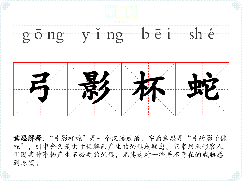 “弓影杯蛇”是一个汉语成语,字面意思是“弓的影子像蛇”,引申含义是由于误解而产生的恐惧或疑虑。它常用来形容人们因某种事物产生不必要的恐惧,尤其是对一些并不存在的威胁感到惊慌。