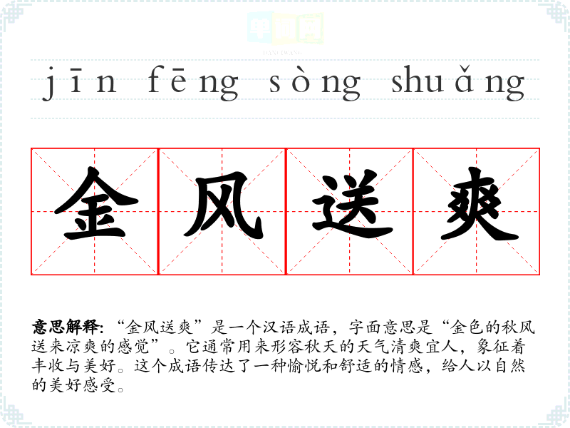 “金风送爽”是一个汉语成语,字面意思是“金色的秋风送来凉爽的感觉”。它通常用来形容秋天的天气清爽宜人,象征着丰收与美好。这个成语传达了一种愉悦和舒适的情感,给人以自然的美好感受。