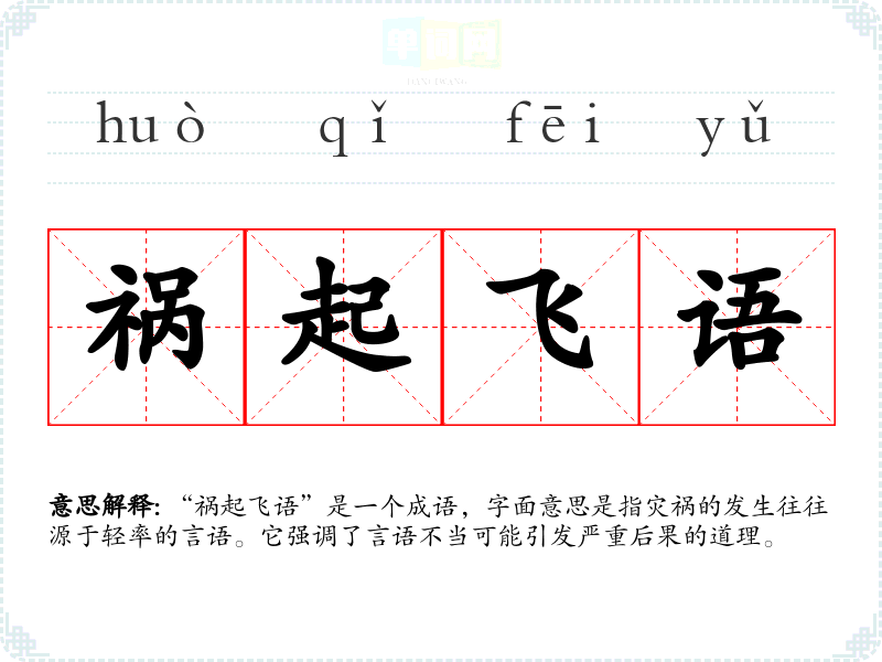 “祸起飞语”是一个成语,字面意思是指灾祸的发生往往源于轻率的言语。它强调了言语不当可能引发严重后果的道理。