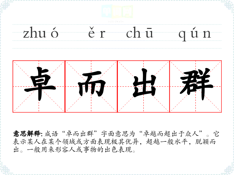 成语“卓而出群”字面意思为“卓越而超出于众人”。它表示某人在某个领域或方面表现极其优异,超越一般水平,脱颖而出。一般用来形容人或事物的出色表现。