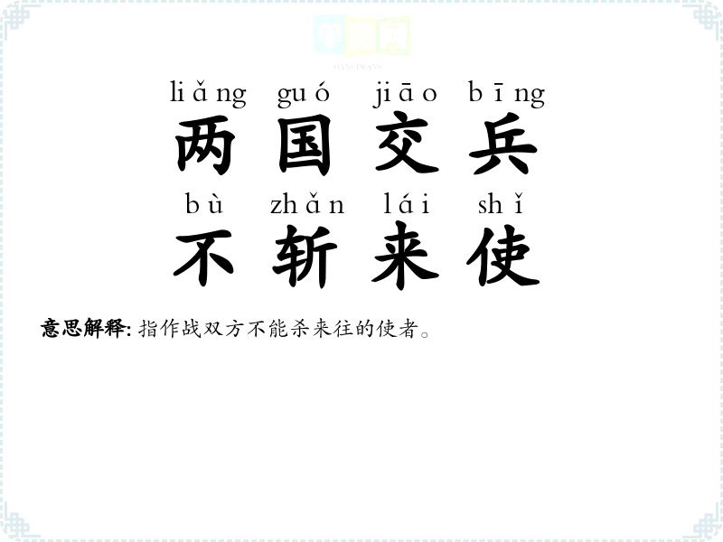 | 两国相战,不斩来使 | 指作战双方不能杀来往的使者。 |