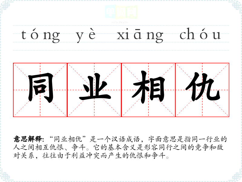 “同业相仇”是一个汉语成语,字面意思是指同一行业的人之间相互仇恨、争斗。它的基本含义是形容同行之间的竞争和敌对关系,往往由于利益冲突而产生的仇恨和争斗。