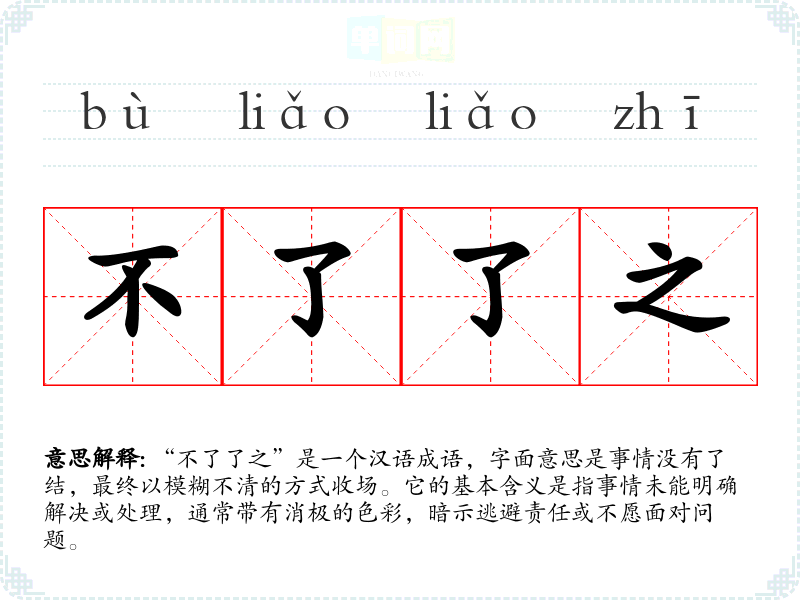 “不了了之”是一个汉语成语,字面意思是事情没有了结,最终以模糊不清的方式收场。它的基本含义是指事情未能明确解决或处理,通常带有消极的色彩,暗示逃避责任或不愿面对问题。