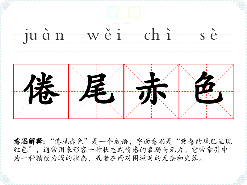 这个成语的具体来源并不明确,可能源于古代文学作品中对疲惫和无力感的比喻。在许多古代诗词中,常常用色彩来表达情感状态,尤其是红色常常象征着激情与活力,而“倦尾”则暗示着疲惫与无力。结合在一起,可以理解为一种对美好事物的失去或对生活的疲惫感。