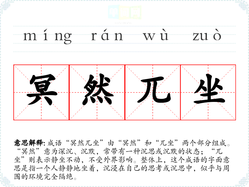 成语“冥然兀坐”由“冥然”和“兀坐”两个部分组成。“冥然”意为深沉、沉默,常带有一种沉思或沉默的状态;“兀坐”则表示静坐不动,不受外界影响。整体上,这个成语的字面意思是指一个人静静地坐着,沉浸在自己的思考或沉思中,似乎与周围的环境完全隔绝。