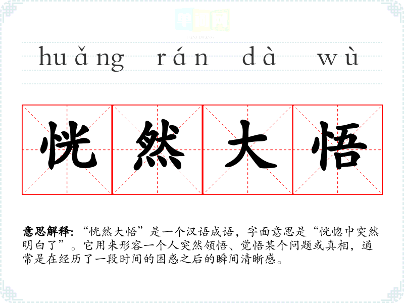 “恍然大悟”是一个汉语成语,字面意思是“恍惚中突然明白了”。它用来形容一个人突然领悟、觉悟某个问题或真相,通常是在经历了一段时间的困惑之后的瞬间清晰感。