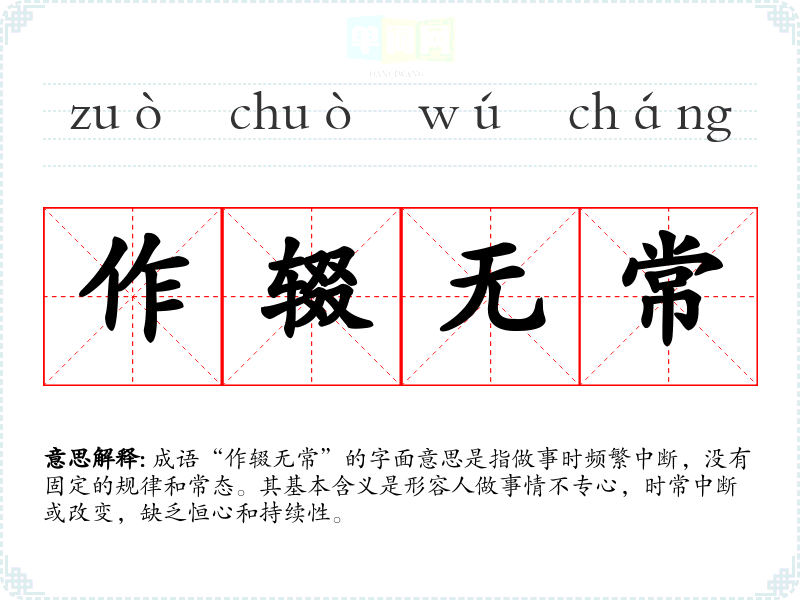 成语“作辍无常”的字面意思是指做事时频繁中断,没有固定的规律和常态。其基本含义是形容人做事情不专心,时常中断或改变,缺乏恒心和持续性。
