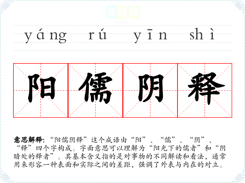 “阳儒阴释”这个成语由“阳”、“儒”、“阴”、“释”四个字构成。字面意思可以理解为“阳光下的儒者”和“阴暗处的释者”。其基本含义指的是对事物的不同解读和看法,通常用来形容一种表面和实际之间的差距,强调了外表与内在的对立。