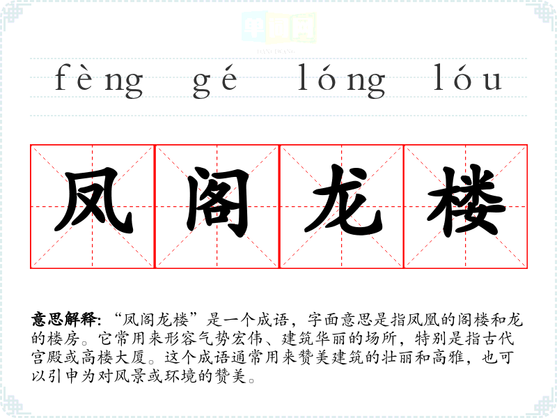 “凤阁龙楼”带给人一种高贵、典雅、气势非凡的情感联想。它让我想起了古代的诗词歌赋,仿佛能感受到那种文化底蕴和历史的厚重。这种情感也激发了我对美好事物的向往,促使我在表达时更加注重语言的美感。