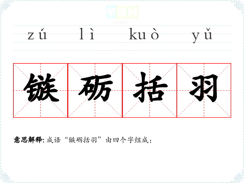 “镞砺括羽”虽然并不是一个广为人知的成语,但可以从字面和字源角度理解其构成。成语中涉及的“砺”与“羽”常见于古代兵器与战斗的背景,象征着在战争之前的准备与训练。其具体历史出处可能与古代兵器的使用和战斗的准备有关,但并没有明确的文献记载。