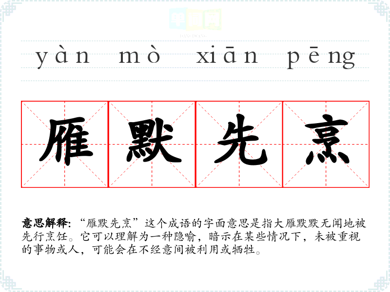 通过对“雁默先烹”的学,我认识到在语言学和表达中,成语不仅是文化的载体,更是情感的表达。我将继续关注那些在生活中被忽视的声音,用语言去传递更多的理解与关怀。