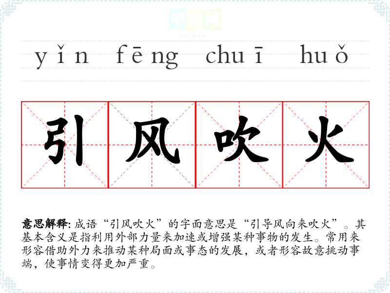 成语“引风吹火”的字面意思是“引导风向来吹火”。其基本含义是指利用外部力量来加速或增强某种事物的发生。常用来形容借助外力来推动某种局面或事态的发展,或者形容故意挑动事端,使事情变得更加严重。