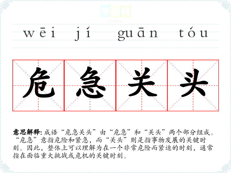 成语“危急关头”由“危急”和“关头”两个部分组成。“危急”意指危险和紧急,而“关头”则是指事物发展的关键时刻。因此,整体上可以理解为在一个非常危险而紧迫的时刻,通常指在面临重大挑战或危机的关键时刻。