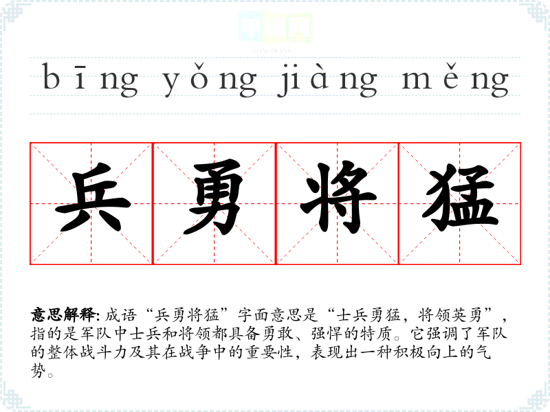 成语“兵勇将猛”字面意思是“士兵勇猛,将领英勇”,指的是军队中士兵和将领都具备勇敢、强悍的特质。它强调了军队的整体战斗力及其在战争中的重要性,表现出一种积极向上的气势。