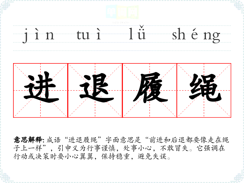 成语“进退履绳”字面意思是“前进和后退都要像走在绳子上一样”,引申义为行事谨慎,处事小心,不敢冒失。它强调在行动或决策时要小心翼翼,保持稳重,避免失误。