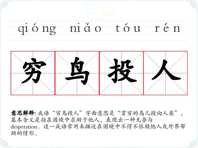 成语“穷鸟投人”字面意思是“贫穷的鸟儿投向人类”,基本含义是指在困境中求助于他人,表现出一种无奈与 desperation。这一成语常用来描述在困境中不得不依赖他人或外界帮助的情形。