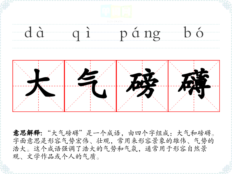 “大气磅礴”是一个成语,由四个字组成:大气和磅礴。字面意思是形容气势宏伟、壮观,常用来形容景象的雄伟、气势的浩大。这个成语强调了浩大的气势和气氛,通常用于形容自然景观、文学作品或个人的气质。