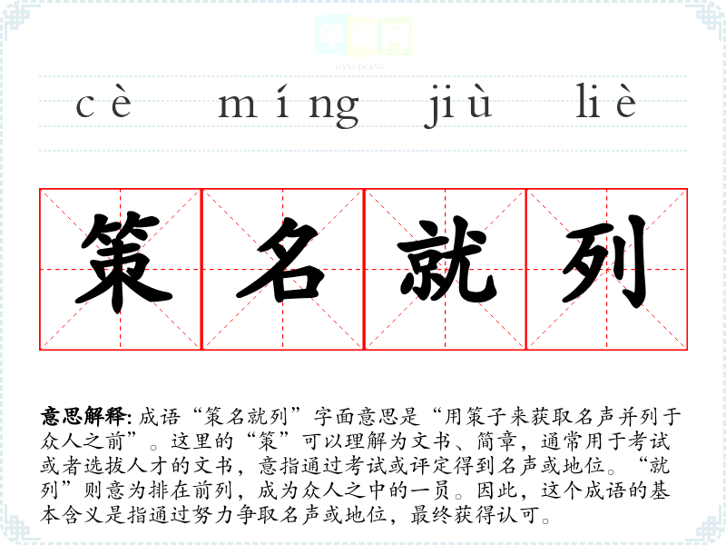 成语“策名就列”字面意思是“用策子来获取名声并列于众人之前”。这里的“策”可以理解为文书、简章,通常用于考试或者选拔人才的文书,意指通过考试或评定得到名声或地位。“就列”则意为排在前列,成为众人之中的一员。因此,这个成语的基本含义是指通过努力争取名声或地位,最终获得认可。